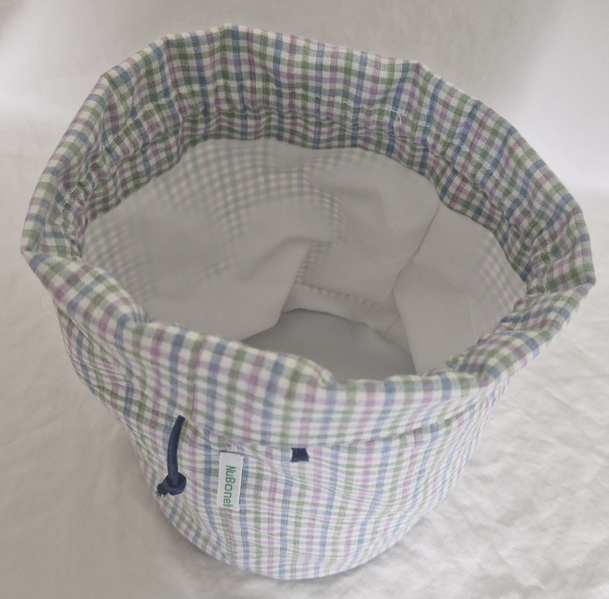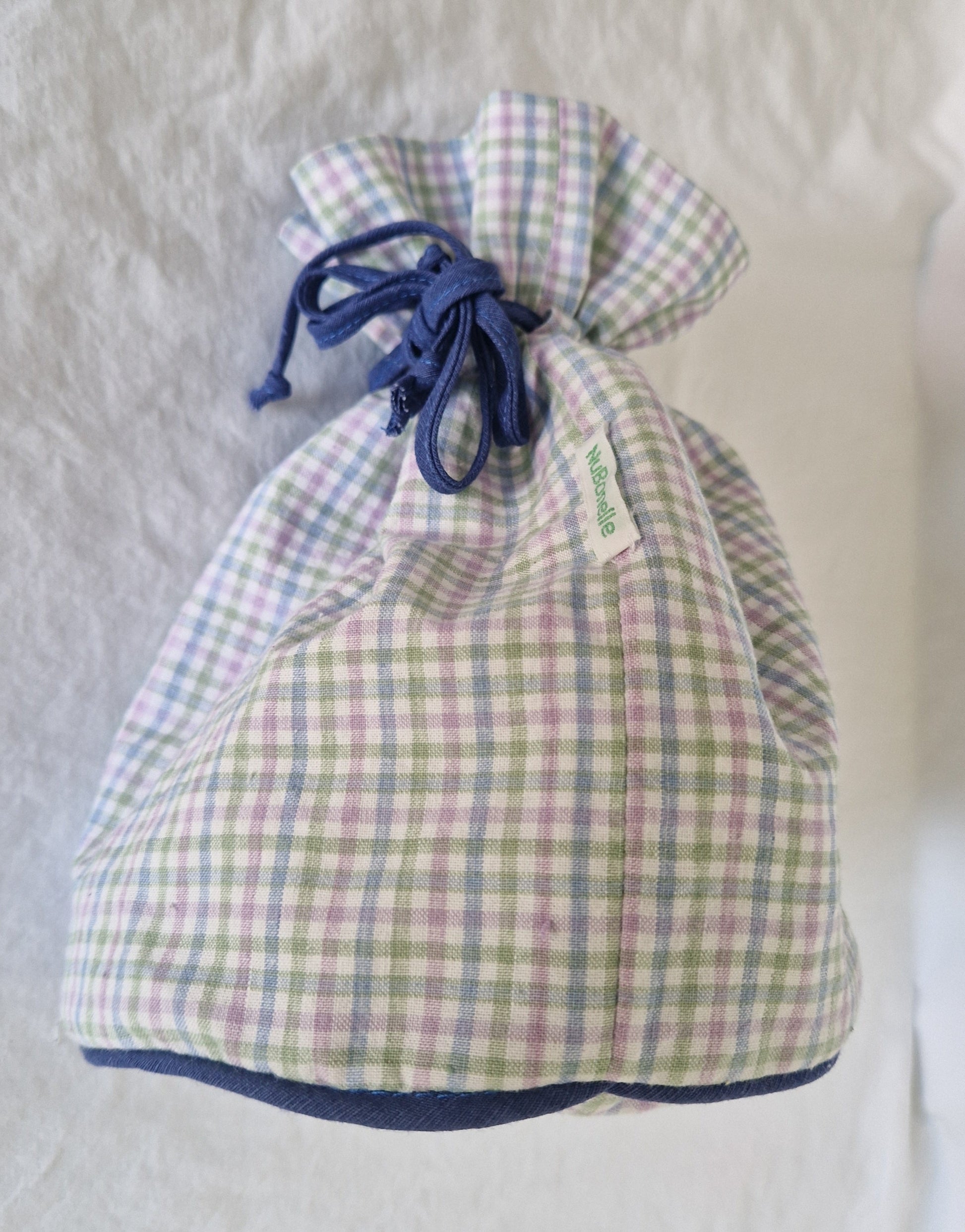 This cotton cylinder bag features a soft checkered pattern in white, pastel blue, green, and lilac. Designed for durability and style, its spacious interior suits daily essentials and household organisation. The waterproof lining covers most of the inside to guard against spills, while the upper section remains breathable. Ideal for transporting toiletries, storage or display, it includes contrasting piping and secure ties for added sophistication and safety.