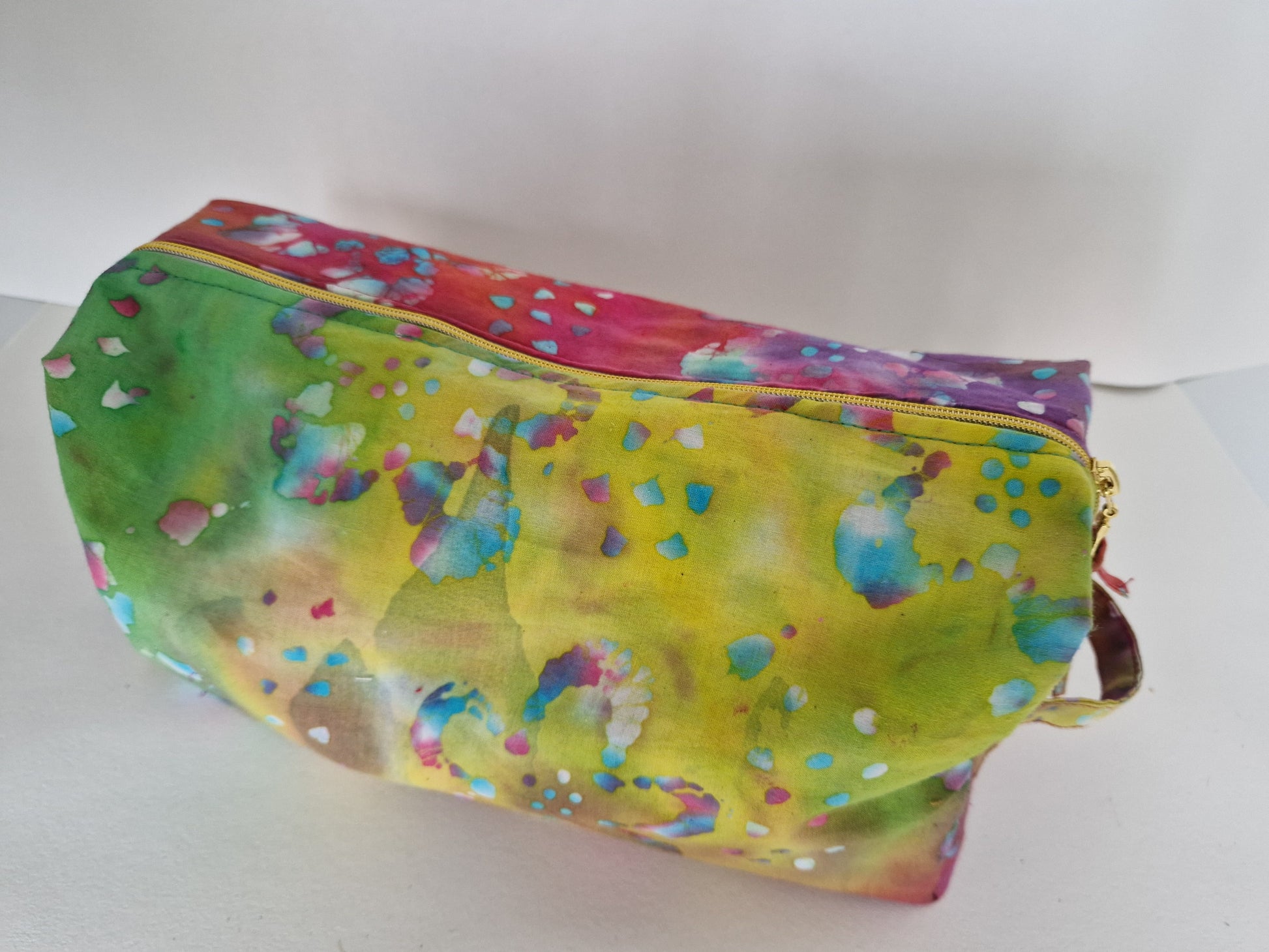 This washbag features a vibrant multicoloured cotton batik fabric with swirling patterns in yellow, green, red and turquoise. It's spacious, rectangular design easily organizes essentials at home or during travel. The soft cotton exterior is complemented by a waterproof lining for protection, and it fits full-size bottles, brushes, and personal items. Finished with a gold zipper and fabric puller, this practical bag is both stylish and practical.